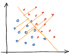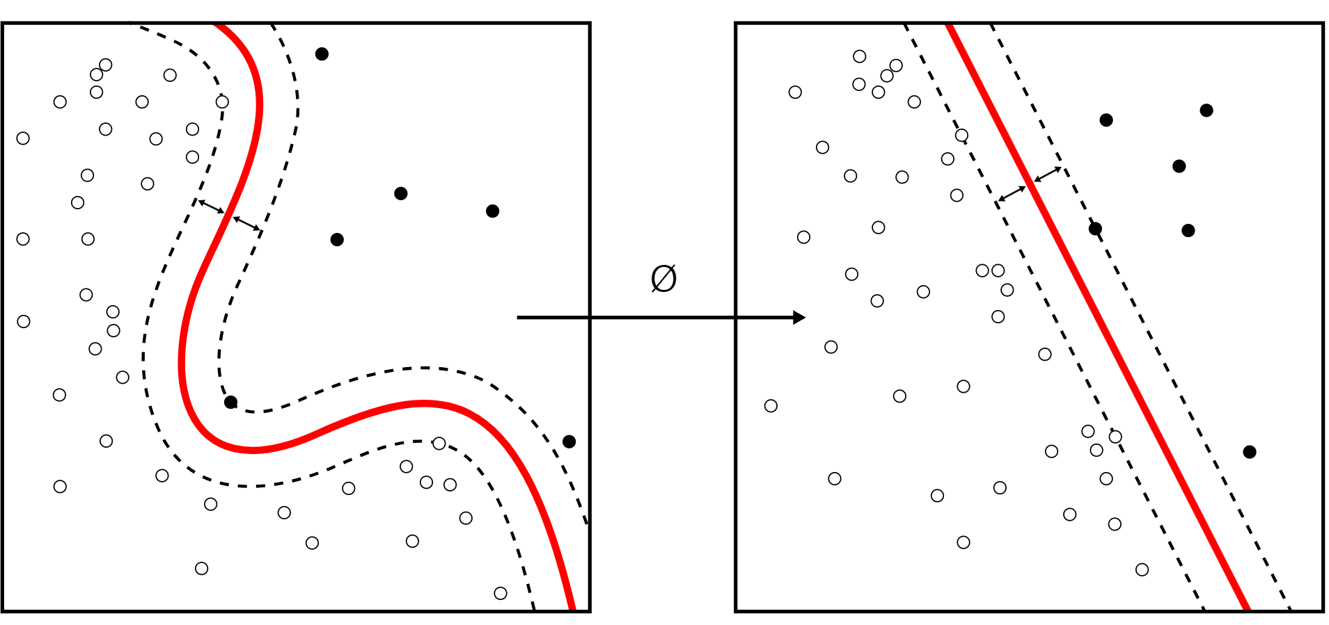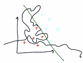 왼쪽의 이미지를 보면 빨간색 포인트와 초록색 포인트를 구분할 수 있는 선형line은 없습니다.