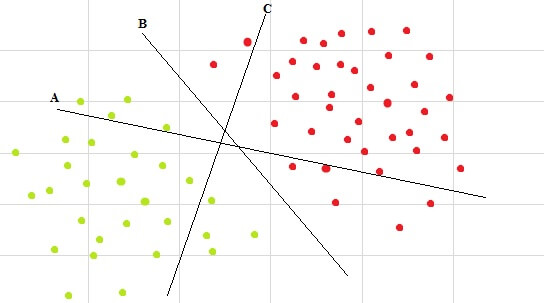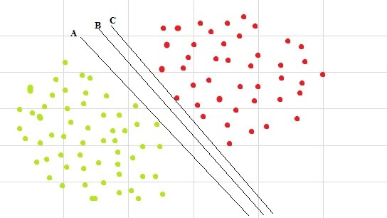 이 이미지에서 두 데이터를 가장 잘 구분하는 선은 B라고 생각되시나요?