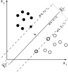 위키백과, 우리 모두의 백과사전. 선형 SVM이 두 자료(흰색 원, 검은색 원)을 직선으로 분리하고 있다. 서포트 벡터 머신(support vector machine, SVM[1][2])은 기계 학습의 분야 중 하나로 패턴 인식, 자료