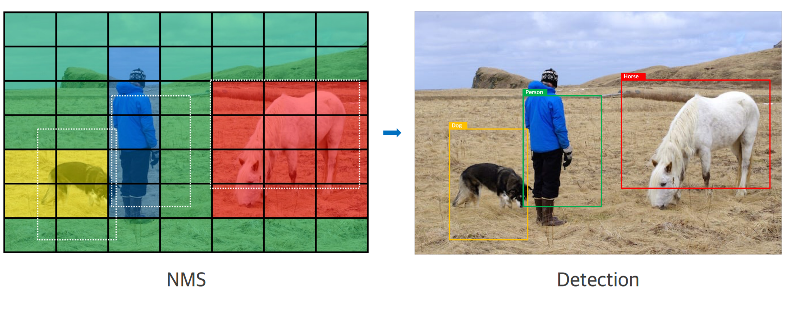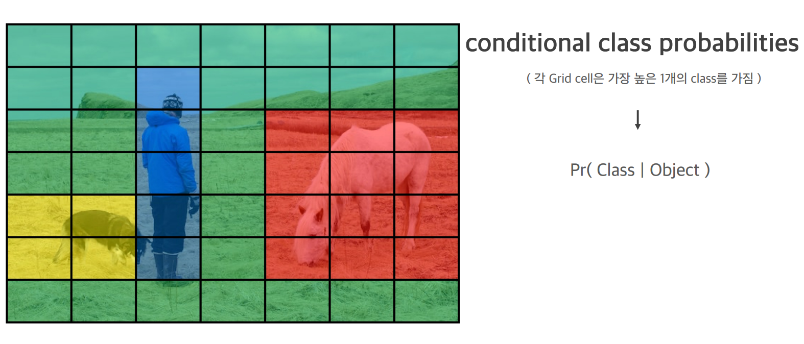각 GridCell 마다 가장 큰 확률의 class를 객체의 종류로 예측합니다.