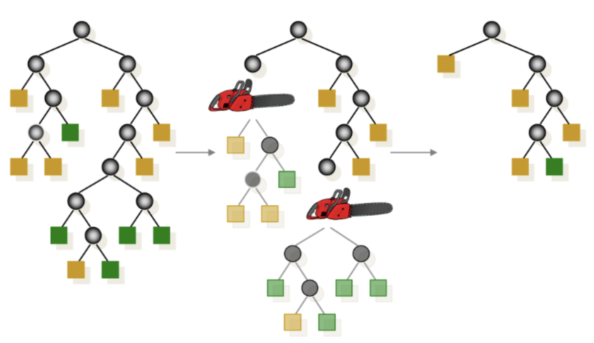 가지치기란 최대 트리로 형성된 결정트리의 특정 노드 및의 하부 트리를 제거하므로서