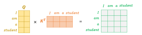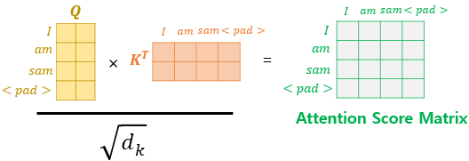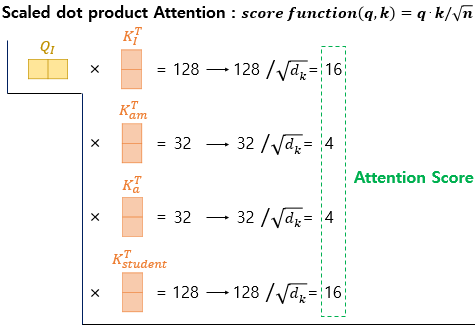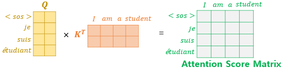 입력의 종류가 다를뿐 Q,K,V 을 이용해 어텐션 스코어 행렬을 구하는 과정은 셀프 어텐션과 동일합니다.