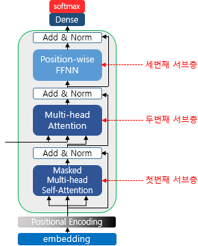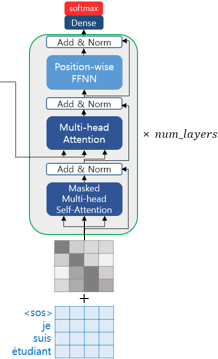 아래의 그림과 같이 디코더도 인코더와 동일하게 임베딩 층에서 포지셔널 인코딩을 거친 후의
