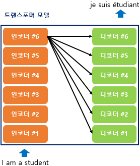 아래는 인코더와 디코더가 6개로 구성된 구조의 트랜스포머 모델을 나타냅니다.