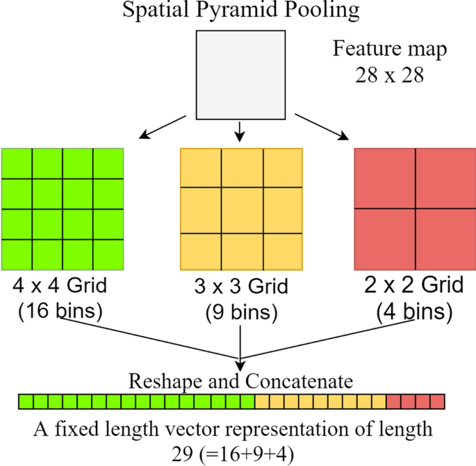 위 그림을 기준으로 보면 feature maps는 4x4 , 2x2, 1x1의 bin들을 가진 각각의 SPP Layer을 통과합니다.