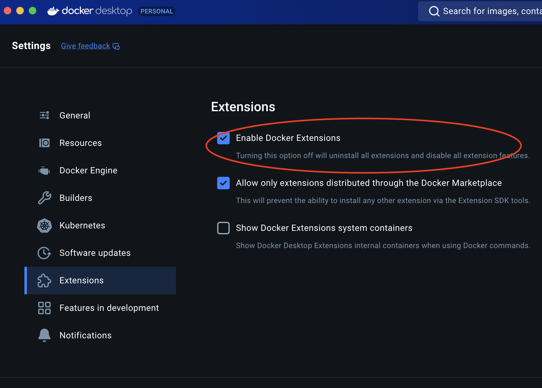 Settings- Extensions에 가서 Enable Docker Extensions를 활성화 해줍니다.