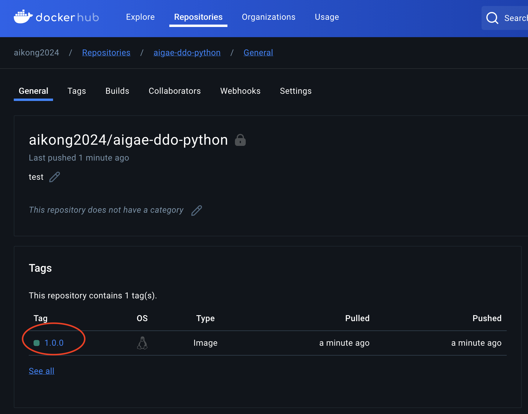Docker Hub에 들어가보면 지정한 tag로 Docker Hub 레포지토리에 잘 올라간 모습을 확인할 수 있습니다.