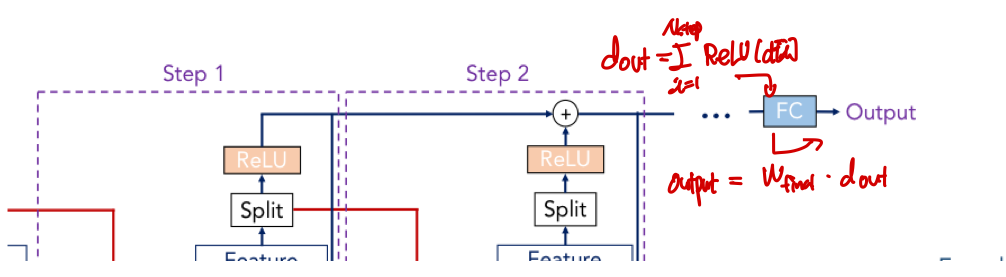 Finally, inspired by decision-tree like aggregation as in Fig. 3, we construct the overall decision embedding as dout = PNsteps i=1 ReLU(d[i]). We apply a linear mapping Wfinaldout to get the output mapping.