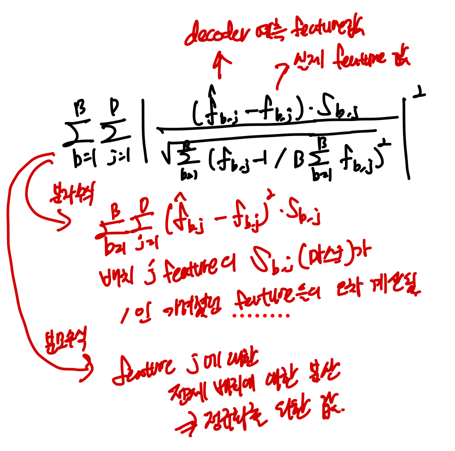 encoder에서는 (1-S)*f , decoder에서는 S*f로 feature를 한쪽에서 가리면 한쪽은 노출되는 구조를 만들어 줍니다.